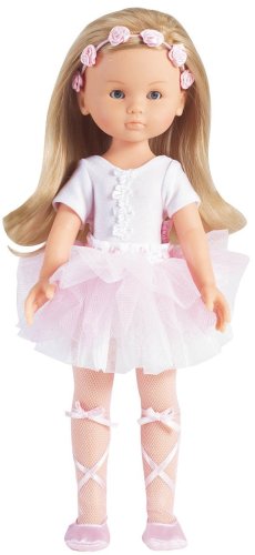 Arabesque, anyone? Les Chiries' Camille Ballerina is recital-ready in a leotard, tutu, tights and pink slippers with ribbon laces. She has an all-vinyl body, moving eyes and long rooted hair that can be worn down or styled up - it can even be shampooed! Blue eyes. Doll measures 13" tall.